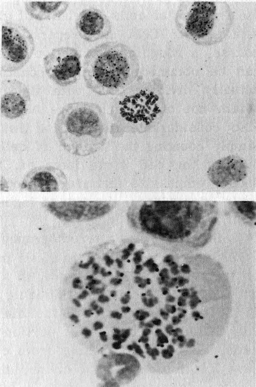 Figure 16 Radioautographs of tumor cells. Above, tumor cells and blood cells. Below, magnification of tumor cells.