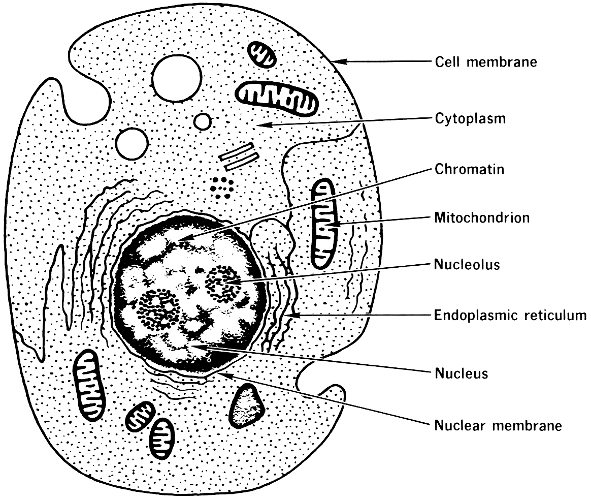 The basic structure of a cell is shown in Figure 2. Each cell consists of a dense inner structure called the nucleus, which is surrounded by a less dense mass of cytoplasm. The nucleus is separated from the cytoplasm by a double envelope, called the nuclear membrane, which is peppered with perforations. The cytoplasm contains a network of membranes, which form the boundaries of countless canals 5 and vesicles (or pouches), and is laden with small bodies called ribosomes. This membranous network is called the endoplasmic reticulum and is distinct from the mitochondria, which are membranous organelles (little organs) structurally independent of other components of the cytoplasm. The outer coat of the cell is called the cell membrane, or plasma membrane, and forms the cell boundary.