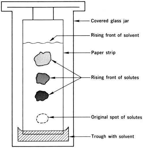 In this technique a mixture of compounds is deposited on the edge of a special type of paper. This edge is then immersed in a solvent that slowly permeates the paper (at a constant speed) by capillary action. As the solvent moves from the immersed edge toward the other edge, which is hanging freely, it carries the mixture of nucleotides with 34 it. Each of the compounds in the mixture travels at a different speed, however; thus, as the solvent front moves along the paper, the dissolved compounds are separated from each other and appear as distinct spots on the paper. To locate the nucleotides on the paper and to determine the percentage composition, we can use a chromatogram scanner, a device that scans the paper chromatograms, measures the radiation from them, and thus locates the labeled substances (see Figure 22).