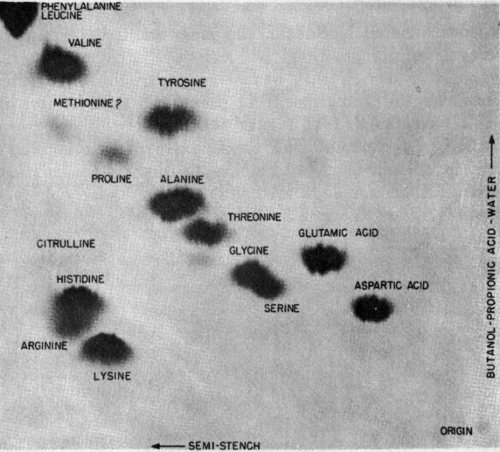 Figure 21 A paper chromatography showing separation of amino acids in two directions. Radioactivity in samples then produced this record by radioautography.