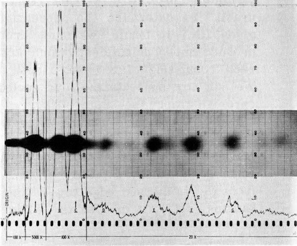 Figure 22 Recording of radioactivity in a sample by radioautography and paper chromatography. The peaks of the trace prepared by a chromatogram scanner coincide with the areas of separated components on the same chromatogram, as revealed by radioautography. The radioautograph is superimposed on the chromatogram recording.