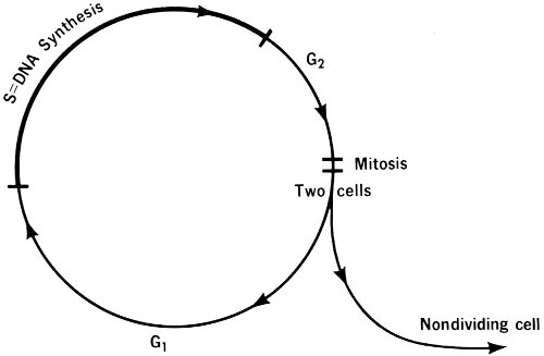 Figure 25 is a diagram of the cell cycle. Try to imagine the cell cycle as a race track and individual cells as cars that race around it. You are sitting at the finish wire, which is mitosis (we chose mitosis because it is easy to recognize when the cell is observed with the aid of a microscope). At a certain time during the race, all the cars in a portion of the track, say a 200-yard sector of the backstretch, are sprayed with a blue dye as they race by. These cars are now marked, just as cells synthesizing DNA are marked if briefly exposed to tritiated thymidine, the common radioactive precursor of DNA. As soon as these cars have been sprayed, you observe all the cars as they pass the finish line in front of you. At first, you will see cars that were nearest the wire and were not sprayed; then the dye-marked cars will pass; and finally more unmarked cars, those that had passed the finish line but had not reached the spray area when the marking was done, will come by. If you replace the words spray, cars, and wire with the words radioactivity, cells, and mitosis, you have described the cell cycle and the flow of cells in the cycle.