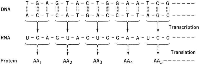 All life processes use up energy and therefore require fuel. The mitochondria have a central role in the reactions by which the energy of sugars is supplied for cellular activity. The importance of this vital activity is obvious. In this booklet, however, we are concerned with the processes, involving nucleic acids and proteins, that can be described as making up “the gene-action system”. The gene-action system is the series of biochemical events that regulate and direct all life processes by “transcription” of the genetic “information” contained in molecules of DNA.