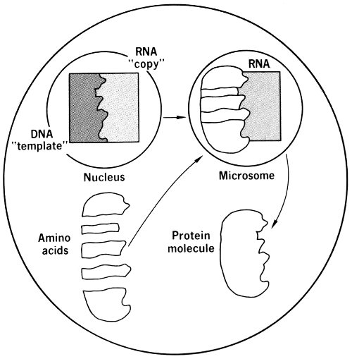 Figure 27 Protein synthesis in a ribosome (microsome), and its control by DNA in the nucleus, using RNA as an intermediary.