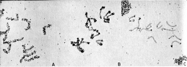 Figure 29 Radioautograph showing DNA synthesis during chromosome replication. Chromosomes from cells in the root tip of the Tradescantia plant were labeled with ³H-thymidine. In A and B, the midportion of DNA synthesis, the radioisotope is distributed throughout the chromosome arms; in C, near the end of DNA synthesis, it is confined mainly to the end of the arms.