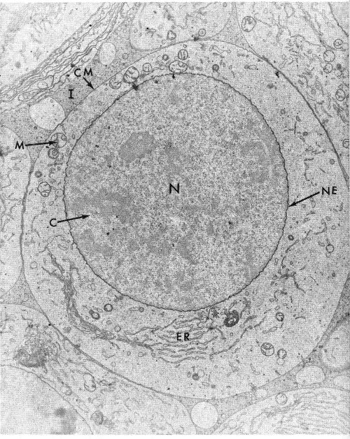 Figure 3 Electron micrograph of a primary spermatocyte cell of a grasshopper, showing the nucleus (N), endoplasmic reticulum (ER), mitochondrion (M), chromatin (C), nuclear membrane or nuclear envelope (NE), cell membrane (CM), and intercellular space (I). The magnification is about 25,000 times the actual size.