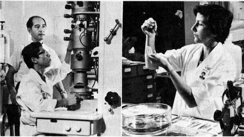 Figure 4 Scientists using an electron microscope (left) and an optical microscope (right) in fundamental biochemical research. Both instruments are important tools in studies of life processes.
