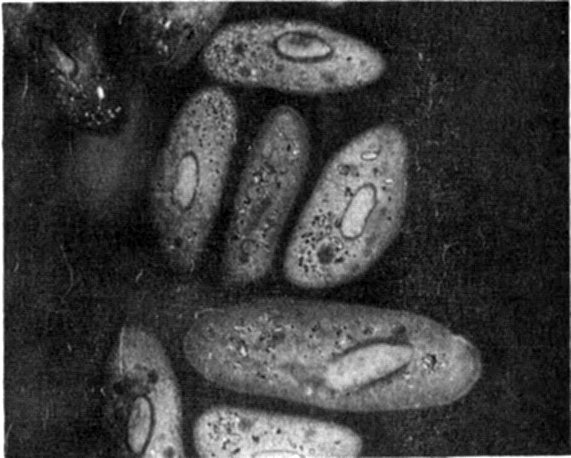 Figure 5 Photomicrograph of Paramecia, one-celled animals, magnified 1100 times. Many of the same structures that appear in Figure 3 can be seen here. This photo was taken with an “interference” microscope designed to permit continuous variation of contrast in the subject under study.