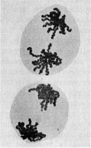 Figure 7 Photomicrograph of cells of the Trillium plant, which has five chromosomes, in anaphase. Note the duplicate sets of chromosomes moving to opposite poles of the cell.