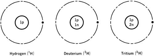 Atoms of the same element, that is, atoms with the same number of protons and electrons, may vary slightly in mass because of having different numbers of neutrons. Since the chemical behavior of an element depends upon its electrons’ electrical charges, extra neutrons (which do not have an electrical charge) may affect the mass of an atom without disturbing its chemical properties. Atoms having the same atomic number but different atomic weights are called isotopes. For example, as shown in Figure 8, the isotope ¹H, or ordinary hydrogen, consists of a nucleus containing a proton (charge: +1; mass: 1) around which revolves an electron (charge: -1; mass: negligible); ²H, known as deuterium, contains an additional nuclear particle, a neutron (charge: 0; mass: 1); ³H, or tritium, contains two neutrons. Since the chemical behavior of an element depends upon the number of its electrons, these three atoms, although differing in weight, behave identically in chemical reactions. For convenience, the atomic weight is written as a superscript to the left of the element’s symbol. For instance ¹⁴C is the isotope of carbon with an atomic weight of 14 (ordinary carbon is the isotope with an atomic weight of 12, and it is written ¹²C).