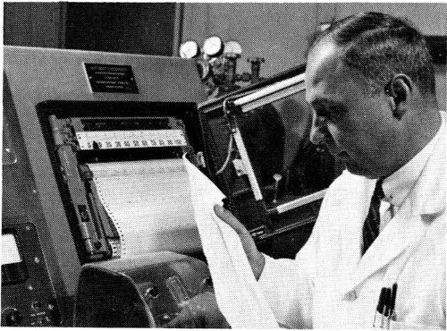 WALTER E. KISIELESKI is an Associate Scientist in the Division of Biology and Medicine of the Argonne National Laboratory. He was formerly associate professor of chemistry at Loyola University in Chicago. His undergraduate studies were at James Millikin University in Decatur, Illinois, and his graduate studies were at the University of Chicago. He received an Honorary Doctor of Science degree from James Millikin University in 1962. In 1958 he was a delegate to the Second Atoms for Peace Conference in Geneva, Switzerland. He was visiting lecturer in the department of biochemistry at the University of Oslo in Norway in 1963. Dr. Kisieleski is shown operating an automatic windowless strip counter that scans paper chromatograms and thus locates labeled substances.