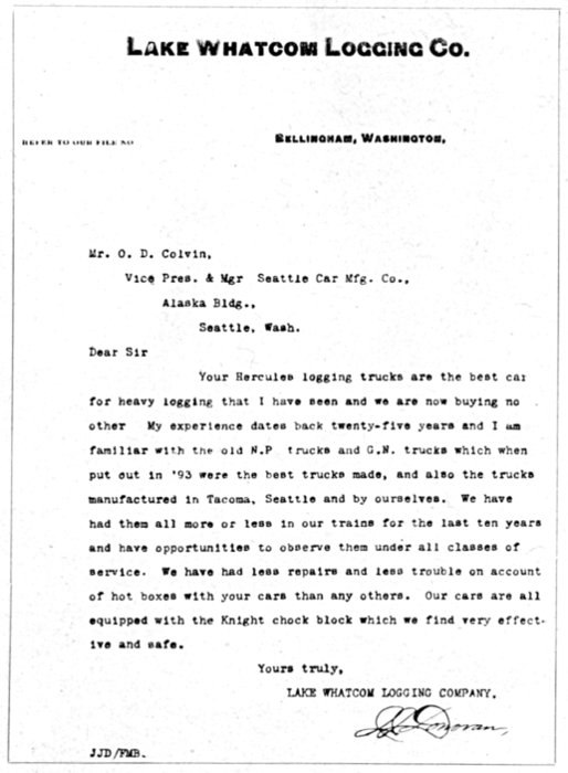 Your Hercules logging trucks are the best car for heavy logging that I have seen and we are now buying no other. My experience dates back twenty-five years and I am familiar with the old N.P. trucks and G.N. trucks which when put out in '93 were the best trucks made, and also the trucks manufactured in Tacoma, Seattle and by ourselves. We have had them all more or less in our trains for the last ten years and have opportunities to observe them under all classes of service. We have had less repairs and less trouble on account of hot boxes with your cars than any others. Our cars are all equipped with the Knight chock block which we find very effective and safe.
