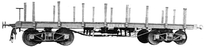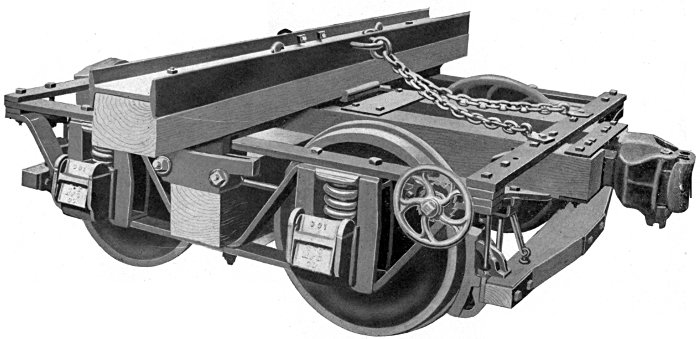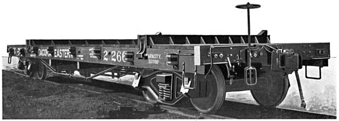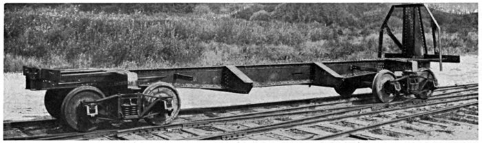 This car was designed with the object of providing heavy capacity Trucks with Air-Brakes, and at the same time reducing the dead weight and maintenance to a minimum. This has become a recognized Standard Logging Car, and as the design permits of considerable latitude in length of car and centers of bunks, we do not hesitate to recommend it to anyone who requires either Flat Cars or Trucks for strictly logging purposes. The convenience of operation as compared with other types of equipment is apparent. From an economic standpoint the comparison is even greater. Some of the advantages are given below in detail: