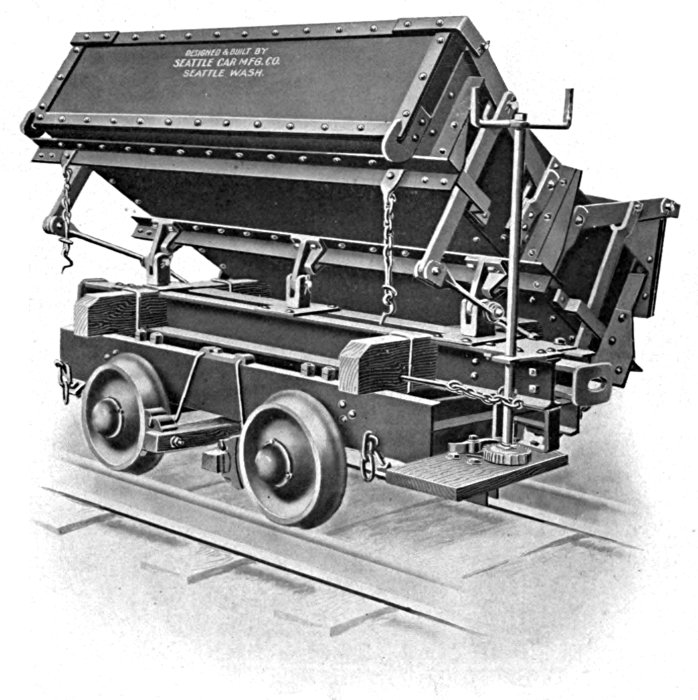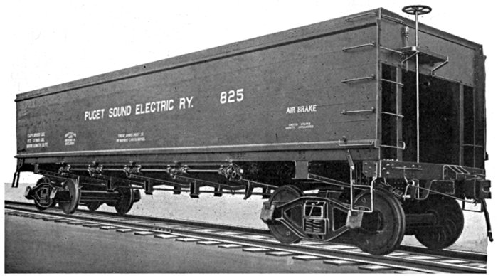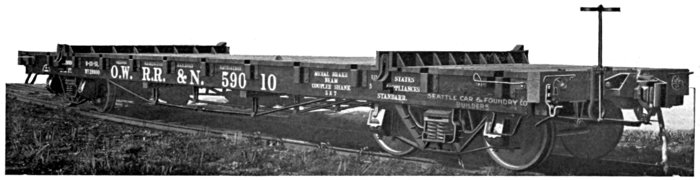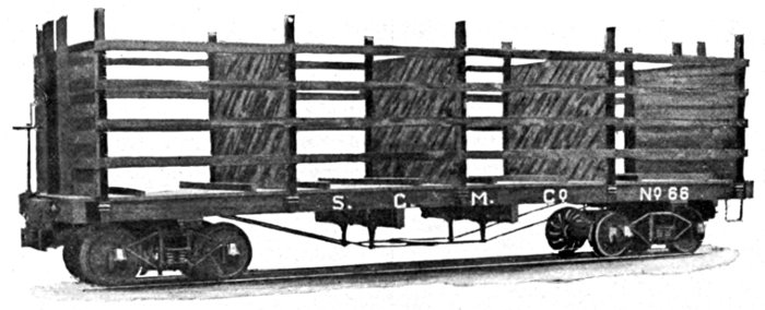 This car has done more to make the name of the Seattle Car & Foundry Co. well known among the logging fraternity than any other single one of our products. We instituted their use on the Pacific Coast. They were designed to avoid many of the obvious disadvantages of flat cars and to add the element of safety to trucks without materially increasing cost.