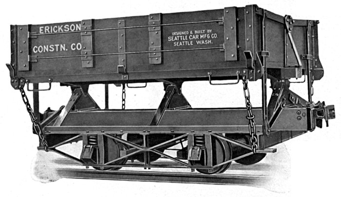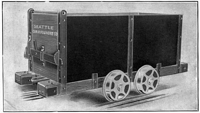 The Seattle Car & Foundry Company was started in 1905 by a few Seattle business men who had faith in the ability of the Pacific Coast to support a home industry of this nature. A steady growth both in scope and quantity of business has confirmed their judgment. Today the Seattle Car & Foundry Company not only competes on an equal footing with the east for the trade of the Pacific, but has extended its field successfully into Alaska, British Columbia, China and all other sections of the Orient. In its commodious, modern and efficient plant it designs and builds Flat Cars, Box Cars, Logging Cars, Logging Trucks, Air-Equipped Connected Trucks, Logging Bunks and Chocks, Gondola Cars, Refrigerator Cars, Plantation Cars and Cane Cars, Caboose Cars, Camp Cars, Industrial Cars, Contractors Dump Cars, Push Cars, Quarry Cars, Track Construction Cars, Tram Cars.