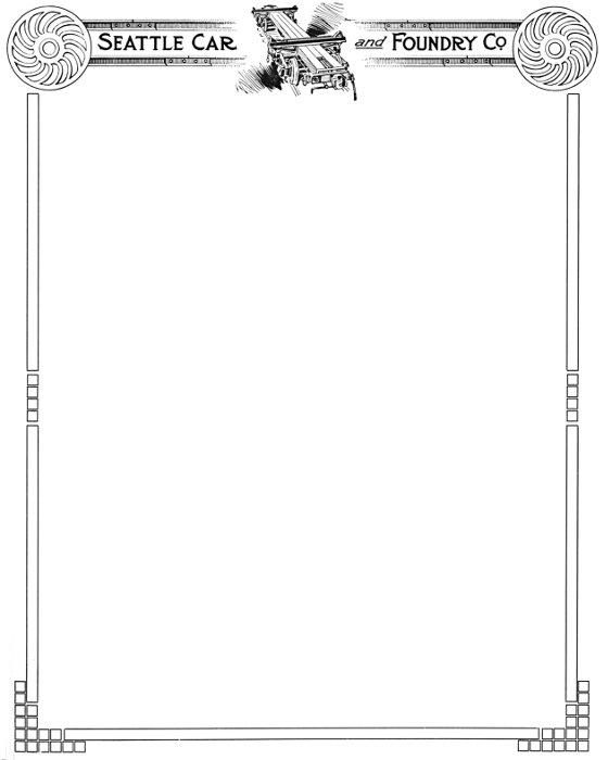 Most pages had a decorative rectangular border with "Seattle Car _and_ Foundry" at the top. Most of the other pages had a simple triple line rectangular border.