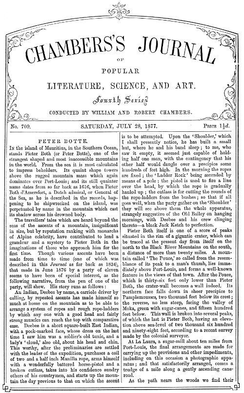 In the island of Mauritius, in the Southern Ocean, stands Pieter Both (or Peter Botte), one of the strangest shaped and most inaccessible mountains in the world. From the sea it is most calculated to impress beholders. Its quaint shape towers above the rugged mountain mass which again dominates over Port-Louis; and its still quainter name dates from so far back as 1616, when Pieter Both d'Amersfort, a Dutch admiral, or General of the Sea, as he is described in the records, happening to be shipwrecked on the island, was perpetuated by name in the mountain which cast its shadow across his drowned body.