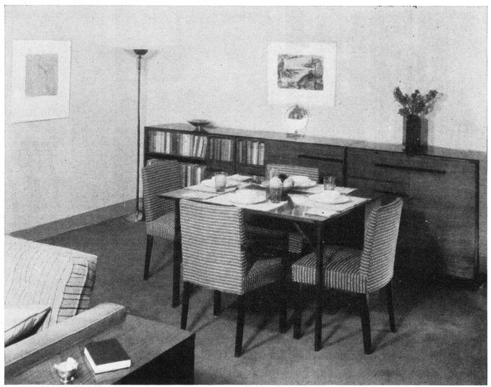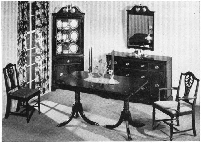 For the dining room there are Sheraton-Hepplewhite groups of "genuine mahogany construction rubbed and then waxed to its deep rich red color." Choice is offered of pedestal dining table, or one of the leg type; also "choice of the famous Hepplewhite shield back or Sheraton model chairs." Other offerings include an Adam group in "genuine Honduras mahogany with beautifully figured swirl mahogany veneers, delicately carved"; an English Chippendale group; an Early American group of solid rock maple construction. Separate pieces for the apartment dining room from which one may create his own ensemble include offerings of a—