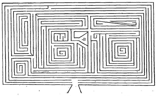 Once upon a time an Eastern sovereign formed a labyrinth of high walls, placed in the innermost recess (B) a large bag of gold, and invited all the officers of the court to explore the maze, declaring that the man who could reach the gold should have it. The Grand Vizier was the first to attempt the task; and when, after several hours, he was rescued by a rope let down from the top of the walls, he was so worn out that he had to be kept in bed and fed on oatmeal gruel and gum-arabic for three weeks. All the other court officials, from the Keeper of the King's Umbrella down to the youngest turnspit in the kitchen, tried for the prize; but all failed, and had to be taken out from above. Then the King issued a proclamation calling upon any or every one of his subjects to come and try his skill or luck, and so many persons attempted the feat that the stones on the floor of the passages began to wear away, even though none of the people wore anything harder than sandals.