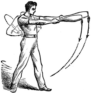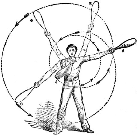‘In other words, that you may bring the centre of gravity over the foot on which you are standing. The centre of gravity moves as your arms move. If you feeling yourself falling towards the left, you throw out your right arm, and that brings the centre of weight more towards the right side. The centre of gravity is but a point; and while you keep that point supported, you may stand upon a point, or upon a rope, or upon anything else. That is how the rope-dancers manage. They usually have a pole, weighted at each end with lead. The man and the pole form, practically, but one body, and have but one centre of gravity; therefore, by moving the pole a very little the performer can easily throw more weight to one side or the other as required, and so bring the centre of gravity directly over the rope.