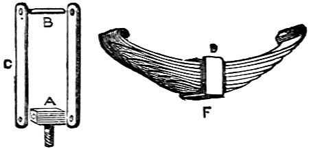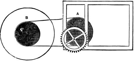 The large ring is 3 inches in diameter, and the bar is 4 inches long. The object is to remove the large ring by pushing it through the smaller ones. The movements are explained by means of the figures and letters written in the diagram. The ring of the bar is called B, the ring of the first loop is 1, that of the second loop is 2, and so on.