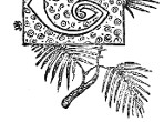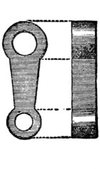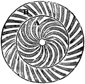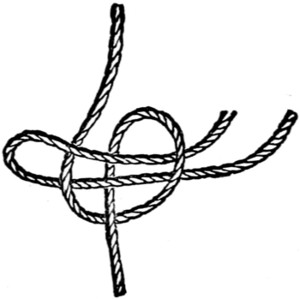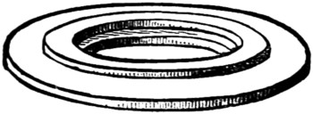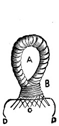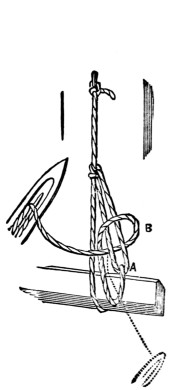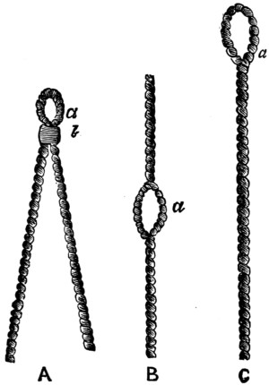The ring is placed on the fourth loop thus: Fold it, push it half-way through 1, over B, back, fold, all through 2, through 1, over B, back, fold, all through 3, through 2, over B and 1, through 1, over B, back through 1 and 2, through 1, over B, back, fold, all through 4, through 3, over B and 1, through 1, over B, back, over 2, through[518] 2 and 1, over B, back, over 1 and B, back through 2 and 3, through 2, over B and 1, through 1, over B, back through 1 and 2, through 1, over B, back, open the ring.