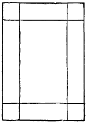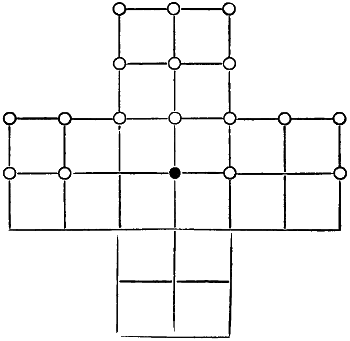 (4) The Six Squares Puzzle.—Take seventeen pieces of stick three inches long and arrange them as in Fig. 3. The puzzle is, by taking away five sticks, to leave three perfect squares, and three only, these three squares to be three of those originally formed, and all the same size. To do this take the two sticks from the two top corners and the middle stick at the bottom.