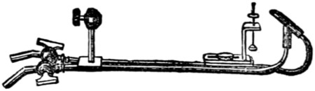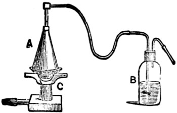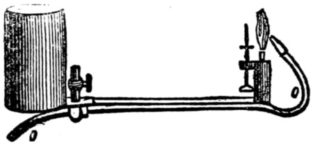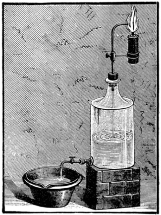 A few very pretty experiments can be made with smoke rings, and as the apparatus is cheap and easily procurable it may be worth while to say a few words about them. The best arrangement for producing satisfactory results is that shown in Fig. 1, where a glass jar with a tap at the base is resting on a stand. Into the jar and through the cork a small tube is fixed and the whole sealed down, so that all air passing into the jar must come through the tube. The finer the tube the better; the material is of no consequence—it may be of metal, glass, or clay—so long as the passage down it is kept clear. To it, as shown in the cut, a holder is fixed, to which the candle or what not is attached, so that the centre of the tube points fairly into the smoke. The jar is filled with water, the cork fixed down tightly, and the candle lighted. The tap is then turned, and as the water runs out it sucks down the smoke, and the rings will be seen rising through the water and forming on its surface, as shown in Fig. 2. These rings will soon disappear and gradually[519] merge into a sort of collar, shown in Fig. 3, where the central bar is the tube leading up to the source of smoke.