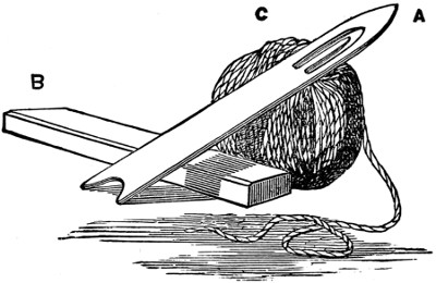 Take the loop and pass it down through one of the corner holes under the thread, and pull the bead down through the loop. Do this to each corner, and the loop will now be seen to surround the whole of the threads: pass the loop down over the cardboard, when the ring will come off. To replace the ring reverse the movement.