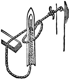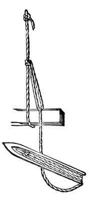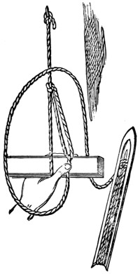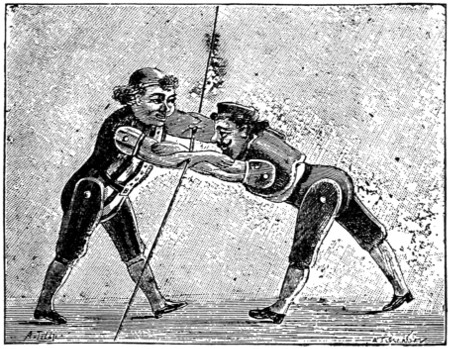 A good deal of amusement can be had out of a pair of model wrestlers. The way in which the dolls are fitted and worked is sufficiently shown in the accompanying illustration. The legs are in one piece, and the arms are joined so that each doll has only four working parts. The feet are loaded to keep the figures upright on the string, but it is not necessary that this should be done, as they can be kept firmly on the table without. The device is a very old one. Curiously enough, in the Hortus Deliciarum of Herrade de Lansberg, Abbess of Hohenburg—a manuscript over seven hundred years old, now in the Paris Library—a man and woman are represented playing with a couple of figures arranged very much on the same principle, the only difference being that the dolls are separate, and worked with two strings instead of one. The figures are knights in complete armour, with swords[523] and shields. They are hung close together, so that the swords are crossed, and the heels are loaded to keep them upright. The strings are crossed, and held one in each hand by the man and woman. The cross comes between the figures, so that the string that is attached to the waist of one figure is fastened to the knee of the other, and any motion forward is balanced by one backward, and a most realistic encounter can be fought out almost automatically.