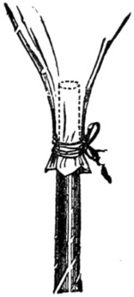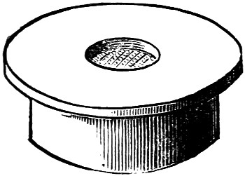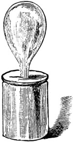 To make the experiment a success it is as well to remember the conditions. The bubble rises because the air it contains is lighter than that which surrounds it; it floats when the air is of the same temperature, it falls when the air within is colder than the air without. The air in the bubble comes hot from the lungs, and the greater the difference in heat between that air and the air you breathe the higher will the bubble go. In short, to have bubbles in perfection you should blow them in an ice room! As it is not every one that can obtain the use of a meat storage[521] safe for bubble blowing, let us make our first experiment in a cool room. Begin with working up a good stiff lather; and the better the soap the better the suds for our purposes. Use your tube as you would your pipe, and blow downwards into the basin steadily and strongly. Take a good breath of air to begin with, and hold it for a second or two. Keep the point of the tube downwards until you have fixed on the disc in the way shown in the sketch. No gum or stickiness is required: all you have to do is to let the dry disc drop lightly on the wall of the balloon; the moisture will keep it in its place provided the knot of the cotton is small enough. If you pass the cotton through with a needle and have the same sort of single knot as if sewing, the disc will answer all your requirements.