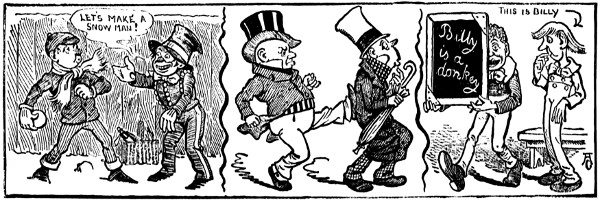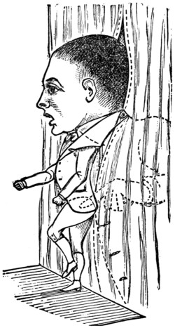 When Living Marionettes are introduced—as they sometimes are at public exhibitions—the effects are most comical. On a small stage an ordinary man’s head is apparently attached to a miniature body, and this latter walks, dances, and goes through many antics. The head, too, has eyes ‘in a fine frenzy rolling,’ and is gifted vocally, being able to talk and sing as well as many persons who fill a much larger space in the world.