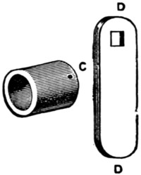 The large ring is folded by moving D upwards, so that it falls on C. Then A is pushed from the left to the right through 1, moved over B (that is, B is pushed through between the two wires), and drawn back through 1. Then the ring is folded the other way and pushed through 2 and 1, over B, back through 1, over 1 and B, and back through 2. Then all through 3. Then through 1, over B, back through 1; folded the other way; all through 2; then through 1, over B, and back; and the ring is off.
