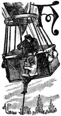 This can be done easily after a little practice, and the sketches herewith make clear how to set about it. Get an ounce of glass tube from the nearest druggist, and cut out of thin paper whatever your fancy leads you to fix to the balloon. As something out of the ordinary lines, we give the exact size of an aëronaut we recently despatched on a cruise (Fig. 1). D is a small disc of paper—proper size; F is a fine thread—proper length below it is the paper figure, cut out of the orange wrapper of one of the Boy’s Own Paper monthly parts, and it is traced from the figure we used.