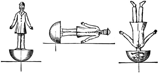 ‘The unstable man here commemorated was a native of Cos. I have enlarged a little upon the description in order to introduce to you a figure which, in some respects, resembles him. Here it is. You may easily make one like it. Get a leaden bullet and cut it through the middle with an old knife and a hammer. Then cut out a light figure of cork or pith, and fasten its feet to the flat part of the bullet. Now if you try to make him lie down, you will not succeed. The moment you let go of him he springs up again and remains in an erect position. Why is this?’