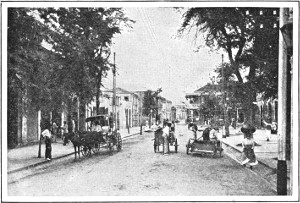 Frederiksted and Christiansted are generally called “West End” and “Basse (Low) End.” Our view of Frederiksted from the vessel had prepared us for a beautiful place. It has some buildings with arched fronts and many white and pink and yellow houses, half-hidden among the strange tamarind and palm and mango trees, but when we got ashore the vision vanished. The arcades were clumsy and crumbling, the streets unpaved and irregular, and the cabins where the negroes lived were far from picturesque. They are built of wood and usually consist of one or two rooms, in which a large family is huddled at night. The people spend most of the daytime out of doors, and meals are prepared in the open air. There is no glass in the windows, and wooden shutters serve to keep out the wind and rain.