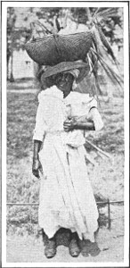 We landed at St. Thomas in front of a little square overhung by palm and mango trees and shaded by lofty ferns, and were at once among a strange population. The children were all dressed in black, as nature made them, with eyes that shone like glass beads. Some of the native women were carrying trays of vegetables, fruit, bread, or small wares upon their heads; others were squatting upon their heels, while in front of them were little piles of sweet potatoes, peppers, limes, or a few sticks of sugar-cane; others were hawking strings of shells and shining beans called “Job’s tears.”