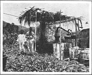 Visitors to St. John find special interest in the bay rum industry. Here the bay tree is indigenous to the soil, no orchards having been set out by man. Three times a year the leaves are picked by nimble youngsters, who throw down twigs bearing perhaps a dozen leaves to women standing ready with bags that have a capacity of sixty to seventy pounds. Oil distillers pay two cents a pound for the leaves and the labor of picking them. When the essential oil is extracted from the leaf, it is mixed with rum or alcohol and water and further distilled to make bay rum. The latter process is mainly carried on by St. Thomas firms. The average price of bay oil in the islands is five dollars a quart; of bay rum, seventy cents a gallon.