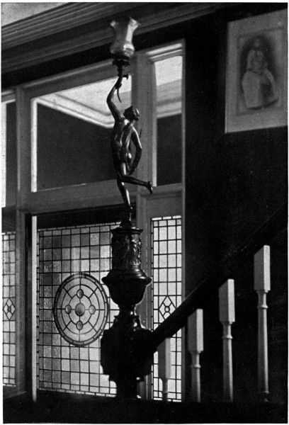 It is believed that on one occasion “old Burgess” forgot to strike, for which he may be forgiven. On the newel post there is fixed a fine old bronze female figure, bearing a light, and on the occasion of a young cleric spending the night with us this statuette was found draped in a Varsity blue wrap (the owner of which has since served as an Army Chaplain throughout the War)—truly a sight to set any decorous time-server off his balance! (Plate I.)