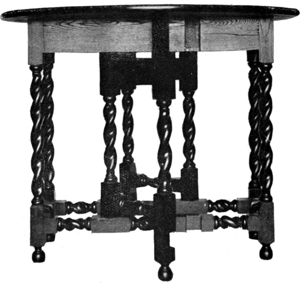 I now received a welcome gift of two high-backed Lancashire Cromwellian black oak chairs from a revered friend, who was wishful to encourage my new craze, and very useful and instructive these have been. I say instructive, for they had not been in the shadow of “old Burgess” long before I compared the grain of their oak and his, with the result that while the panel in the back and front leg spindle of one was finely carved, and the oak undoubtedly 17th century, in the other they were as modern as the frames. I may here mention for the benefit of any reader who does not know that old oak furniture is seldom black with age, and that the polisher can stain it any shade preferred, that when Nelson’s flagship, the Foudroyant, built in 1797, was wrecked at Blackpool in 1897, much of her oak was made into furniture, and some fine chairs quite light in colour may be seen at the Hotel Metropole there. I have a black gate-legged table made from Foudroyant oak which is an exact replica of a good Cromwellian design with twisted legs, and which was quite light in colour until it was stained (Plates X and XI).