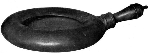 As regards myself, I could fill a volume with the interesting events I have witnessed and the conversations I have heard, but the space placed at my disposal is so meagre I will limit my disclosures to the last few years of my existence. Owing to circumstances over which I had no control, after a lengthy period of neglect I was condemned to occupy an undignified position in a broker’s window, where the odour of paraffin was most repulsive to my susceptibilities. I was dozing in the dark one evening when I heard a voice inquiring, “Have you any pewter?” and the reply, “There is a thing in the window, but I think it has some copper about it.” Some money changed hands, I was wrapped in soiled paper and carried to this home, where I was shocked to see a lot of horrid pewter in the hall and[147] elsewhere, and I was introduced to the family in this way, “I don’t know what it is, but it is juicy heavy.”