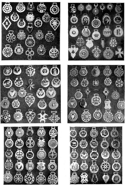 I have now reached a course which I am afraid I shall not find easy-going. My attention was first drawn to horse amulets or face brasses in an article in the Connoisseur for October, 1911, but it was not until 1913, when I came in touch with the proprietor of an antique shop who had dabbled in these things for some time, and who obligingly talked to me about them, that I decided I would add a few to my collection, as they might be interesting and would occupy small space. My first purchases resulted in my bringing home on approval quite a number which I had obtained from a dealer, who informed me that the brasses were usually collected in pairs. I referred this find to the friendly antique proprietor, who, after looking them through, asked if I had paid for them, and he said it in such a way that I evaded the question by enquiring “Why?” His answer was, “Because there are several stamped pieces, and you should only buy cast ones; besides, what do you want pairs for?”