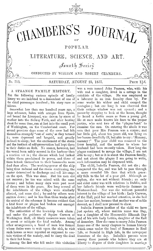 Somewhat less than one hundred years ago, a large schooner, laden with oranges from Spain, and bound for Liverpool, was driven by stress of weather into the Solway Firth, and after beating about for some time, ran at last into the small port of Workington, on the Cumberland coast. For several previous days some of the crew had felt themselves strangely 'out of sorts,' as they termed it; were depressed and languid, and greatly inclined to sleep; but the excitement of the storm and the instinct of self-preservation had kept them to their duties on deck. No sooner, however, had the vessel been safely moored in the harbour than a reaction set in; the disease which had lurked within them proclaimed its power, and three of them betook themselves to their hammocks more dead than alive. The working-power of the ship being thus reduced and the storm continuing, the master determined to discharge and sell his cargo on the spot. This was done. But his men did not recover; he too was seized with the same disease; and before many days were past most of them were in the grave. Ere long several of the inhabitants of the village were similarly affected, and some died; by-and-by others were smitten down; and in less than three weeks after the arrival of the schooner it became evident that a fatal fever or plague had broken out amongst the inhabitants of the village.