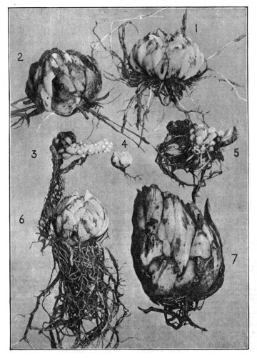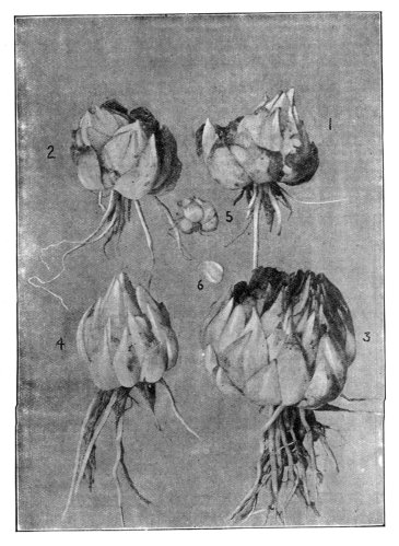 We said lily bulbs should be of moderate size. No point is more misleading or less important than this question of size. Mere size goes for nothing! Some of the "mammoth" bulbs of auratum, so much advertised by nurserymen, often send up a miserable spike of flower-buds which wither ere the flowers open. We think that we know what is the cause of so many large bulbs going wrong. If the buds of a lily be cut off, the bulb increases enormously in size, and next year sends up a very superior shoot bearing many fine blossoms. Lily growers often cut off the flower buds from their lilies so as to improve the bulbs. These large bulbs are excellent. But the bulbs greatly increase in size if the plant does not flower for a year. Even if the whole plant dies from drought (a very common cause of failure with lilies), or if the roots are destroyed by vermin or by disease, the bulbs often become enormous. These large bulbs rarely do well, as the disease which killed their shoots the first year will probably do so again the second year.