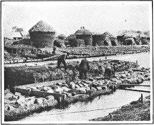 In the country surrounding Courtrai, Ypres, Ghent, flax is extensively grown to supply the demand for linen. Here we see it in the process of “retting” in the river, to rot off the woody bark and stems