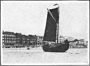 A fishing village and summer resort on the North Sea coast, near Ostend. At low tide the beach is a moorage for trawlers of the fishing fleet