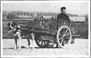 No one that has ever looked over the hedge of a Belgian pasture will ever forget the sight of black and white cows as large as prize bulls in other countries, and of awkwardly cavorting colts, taller and much heavier about the joints than ordinary American farm horses. On the cobbled roads of Belgium one meets these splendid horses, moving ponderously, embraced by the shafts of capacious two-wheeled carts. Equally picturesque are the dogs of burden, hitched single, or in teams of two or three, drawing wagon-loads of milk, bread or fuel. Not infrequently, one or more members of the owner’s family are included in the load the dogs must pull. I once counted a jovial group of seven persons seated on meal-bags in a cart drawn by a panting pair of mastiffs. At country cross-roads the sign is frequently displayed: “Treat the animals with kindness”; but violations of the laws of humanity are so common as to excite little comment among the blunt-mannered country-folk of Belgium.