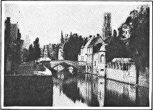 No one that roams today the quaintly narrowed streets of Bruges, or stands upon its many bridges gazing upon the green of quiet waters, where swans drift and storied towers cast their shadows, would guess that traders from far Novgorod and the cities of Persia, from Spain and all the countries of Europe once animated its highways. Every ruler, every industry, every craft and art that contributed to the dowering of Bruges left upon it some well-graved mark, which Time has not erased. In the old quarters—and there are few new ones—there is scarcely a street that does not offer some reward to the sight-seeker—some fretted casement or sculptured entrance-way, some gracefully designed structure that has a special story of its own, and gives shelter to works of art beyond price. Rising benevolently above the great square is the quadrangular belfry tower, as lofty as it is historic, that Longfellow has made familiar to us all.