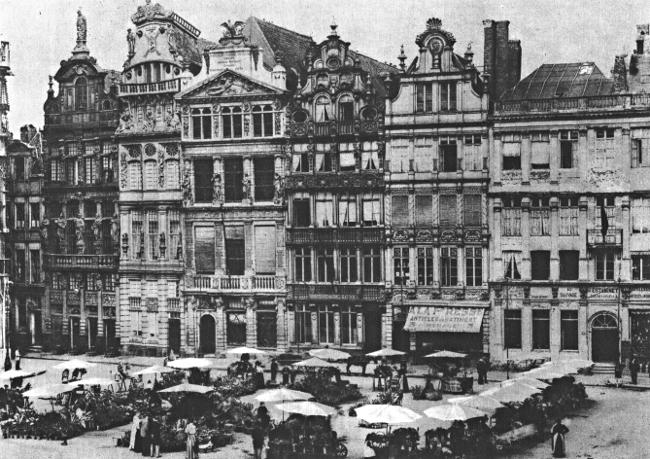 It is the custom for nearly everyone in the city to rise soon after daybreak. Housekeepers, even those highly placed in the Brussels world, go early to market. Beneath the florid gables of the Grand’ Place, white-capped farm-women sit behind their stalls of dewy vegetables and cheese and butter and home-grown posies, while the noise of barking dray-dogs, stabled in a neighboring street, obtrudes upon the bargaining. The men are in their places of business by half-past eight. At noon all Brussels dines, heavily and well; food prices, in peace times, are never excessive. After supper those that seek diversion outside their homes visit the Flemish and French theaters, or the Opera, or they go to a café where, over a convivial cup or glass, they listen to a well-chosen program of orchestral and organ music. Sometimes a member of the Opera company appears, or an instrumentalist in popular favor. The checker-board is in evidence; some of the patrons write letters, others read native and foreign journals, supplied by the management.… By half-past ten the room begins to empty. The good burghers of Brussels, their wives and their children take their way homeward, and to bed.