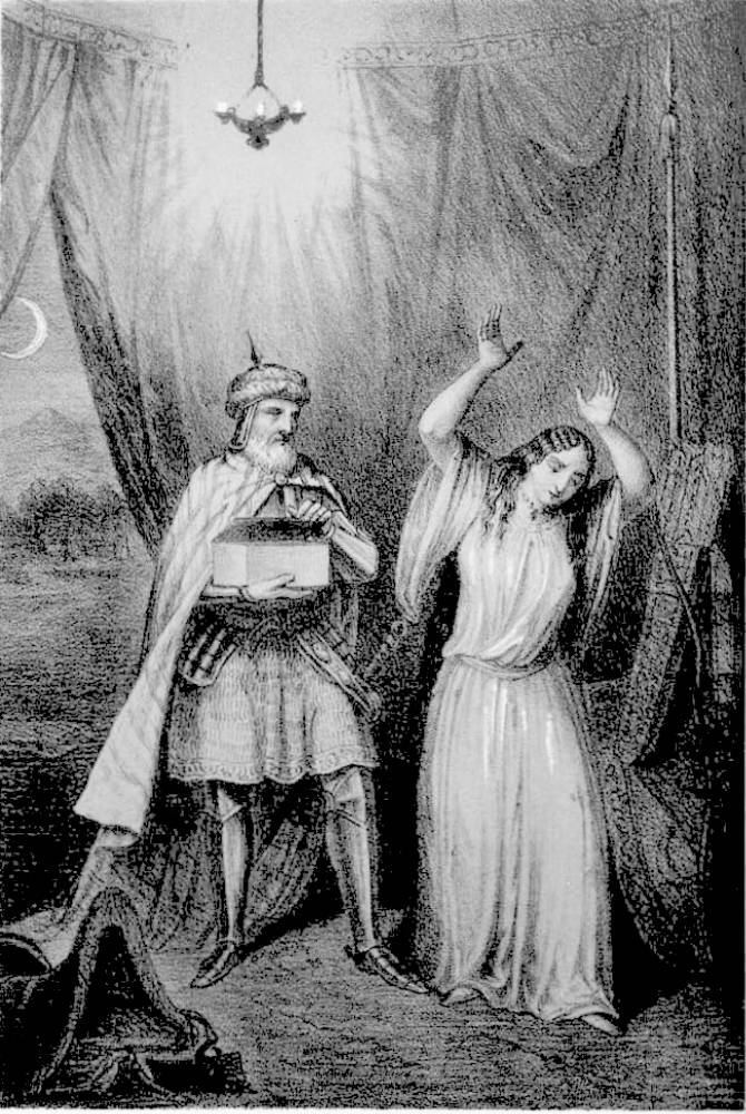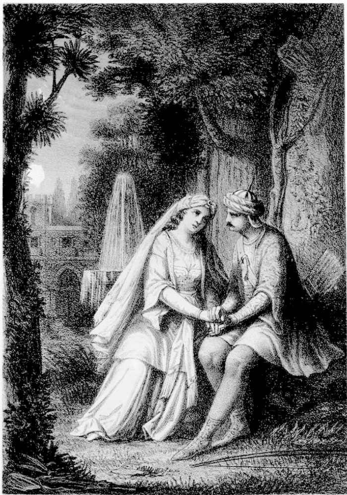 —¡Oh! tú quien quiera que seas, esclamó, muger ó hurí, fruto bendito de una muger, ó arcángel del sétimo cielo; héme aquí que es la tercera vez que abandonando á mis guerreros vengo en tu busca: héme aquí ciego sin la luz de tu hermosura, y si no apagas con tu amor la sed de mi corazon, moriré como la triste florecilla á quien faltan los rayos del sol.
